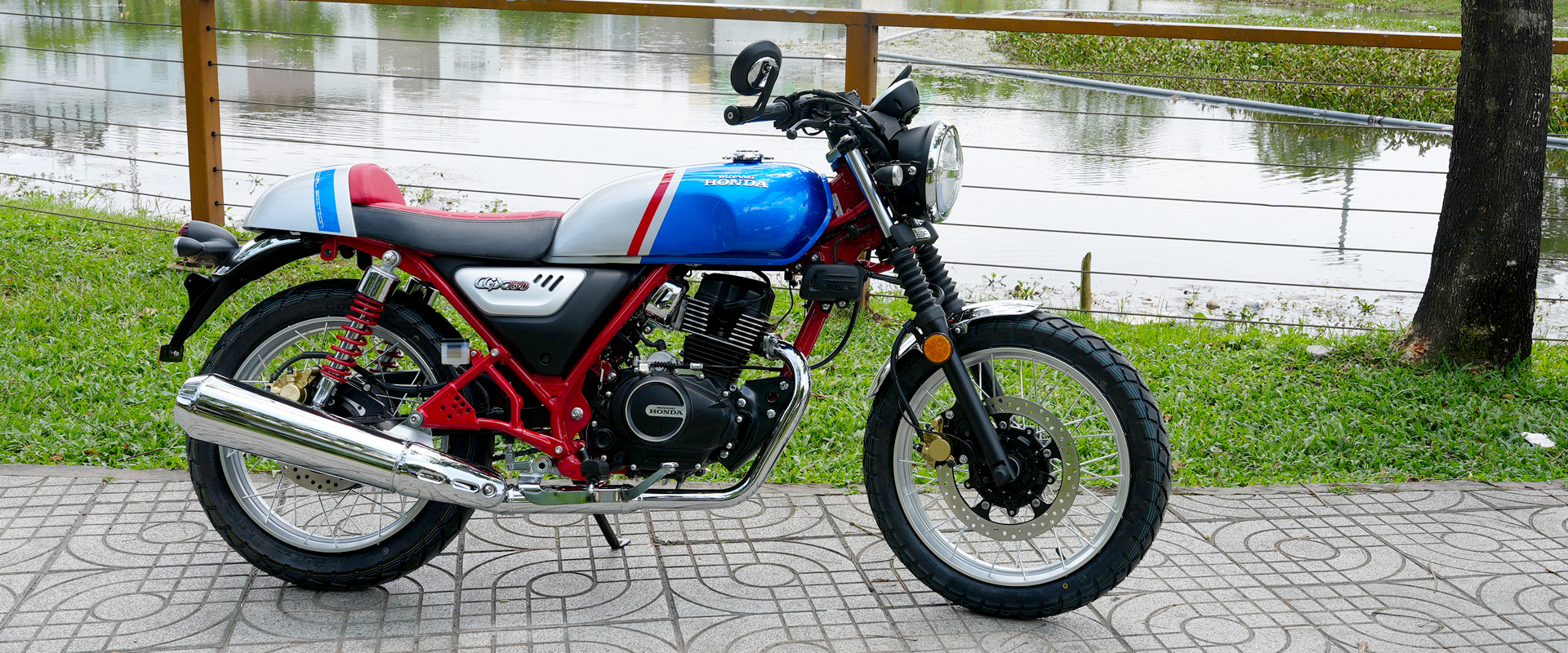 Ghi đông thấp tạo tư thế lái ôm sát, yên xe truyền thống mềm mại giúp người lái không mỏi khi di chuyển lâu. Màu sơn HRC đỏ thể thao là điểm nhấn cá tính, làm nổi bật thiết kế retro mà không bị lỗi thời.